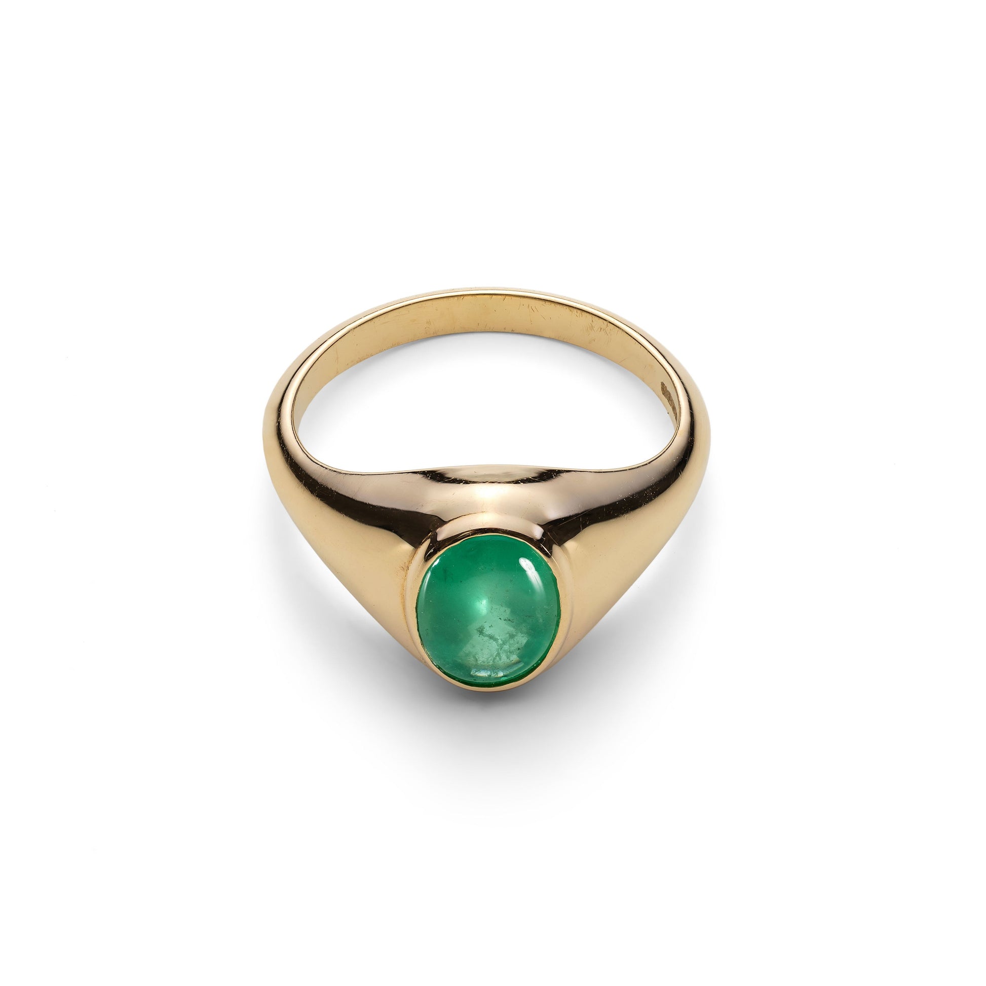 Beautifully simple statement ring featuring a buff cut (smooth top) Emerald.