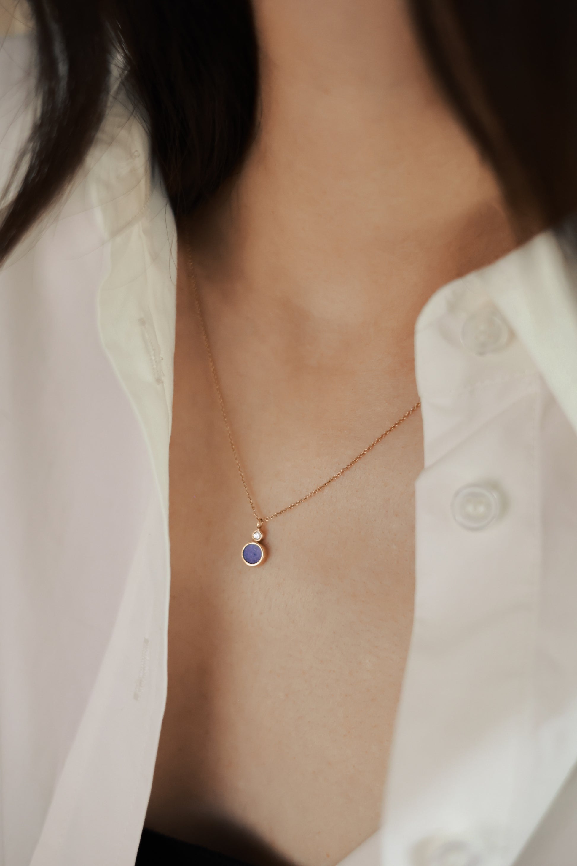 A pendant set with a disc of celestial looking Lapis Lazuli and a brilliant white diamond.