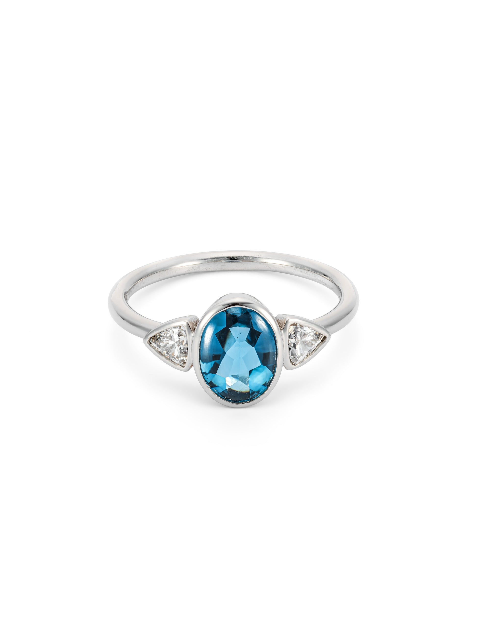 London Blue Topaz has a wonderful vivid and deep hue. This one has been set in Platinum with trillion cut white diamonds for a more icy look. A modern classic.